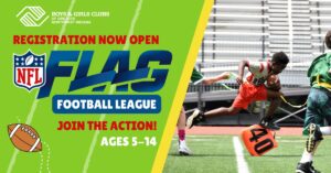 Are you ready for some football? Registration for our upcoming NFL Flag Football season is now open through May 15! Open to members ages 5 to 14, our league focuses on teaching the fundamentals, promoting healthy lifestyles, and fostering lifelong friendships. Whether they are a first-time player or a seasoned pro, there’s a place for every athlete in our huddle.